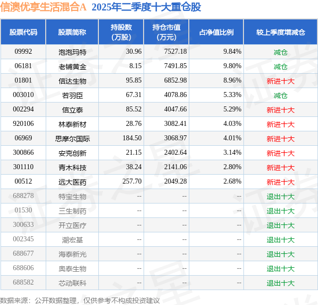 根据2025基金半年报公募基金重仓股数据,重仓该股的公募基金共4家,其中持有数量最多的公募基金为信达澳亚基金的信澳优享生活混合A。信澳优享生活混合A目前规模为2.79亿元,最新净值1.1668(9月29日),较上一交易日下跌0.41%,近一年上涨53.87%。该公募基金现任基金经理为杨珂。杨珂在任的基金产品包括:信澳健康中国混合A,管理时间为2020年5月13日至今,期间收益率为59.85%;