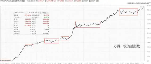 下图为万得二级债基指数基日以来的走势,可以看出,虽然指数表现长期稳健,但总会有一些年份“原地踏步”。(2003-12-31至2025-09-30,数据来源:Wind)