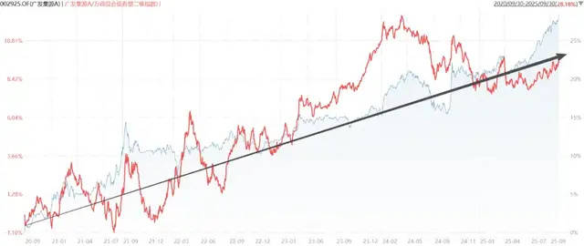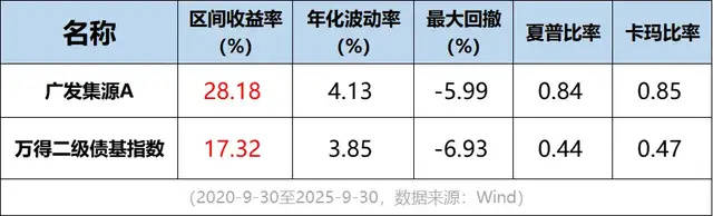下图为广发集源债券A/万得二级债基指数,大致代表广发集源债券A相对同类基金的超额收益,可以看到,产品长期稳定地跑赢了市场平均水平。(2020-9-30至2025-9-30,数据来源:Wind)