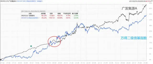 刘志辉的代表作是广发集源债券,是一只二级债基,自其2017年2月6日开始管理,截至2025年9月30日的区间年化收益率为4.7%。下图是刘志辉任职以来的产品净值走势,相比万得二级债基指数的对比(代表同类基金平均水平),可以看出,基金的创新高能力很强。(数据来源:Wind)