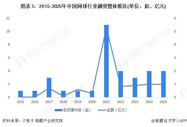 根据IT桔子数据显示,我国网球行业投融资事件发生较少,2015-2020年行业融资持续低迷,年均投资事件仅1.5起、金额0.3亿元,反映出彼时网球运动普及度低、商业价值未被发掘的现状。2021年成为行业融资分水岭,投资事件激增至11起、金额达5.28亿元,这与《全民健身计划(2021-2025年)》出台、青少年网球人口激增及智能装备技术突破直接相关。2024年全年仅发生4起投融资事件,投资金额达1亿元。截至2025年11月27日,我国网球行业融资事件发生4起,投资金额为1亿元。
