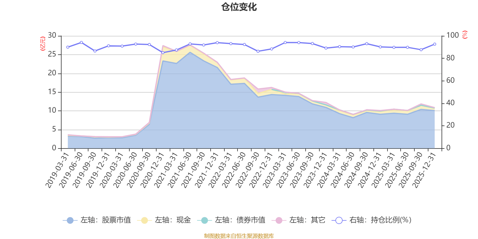 据定期报告数据统计,近三年平均股票仓位为91.16%,同类平均为87.64%。2019年上半年末基金达到94.15%的最高仓位,2020年末最低,为85.08%。