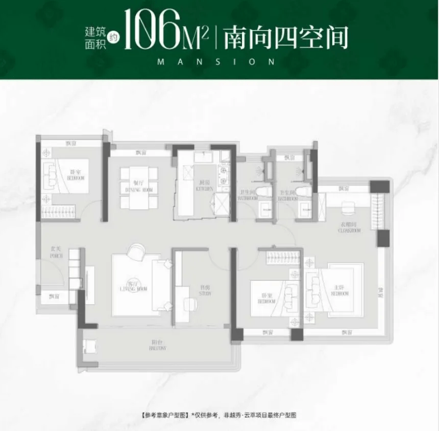 106㎡四房总价约580万元起,做到了南北通透,采光和通风效果良好。户型布局合理,主卧带独立卫浴,能为业主提供私密舒适的居住体验。该户型同样采用精装修交付,配备智能家居系统,满足改善家庭对居住品质的需求。