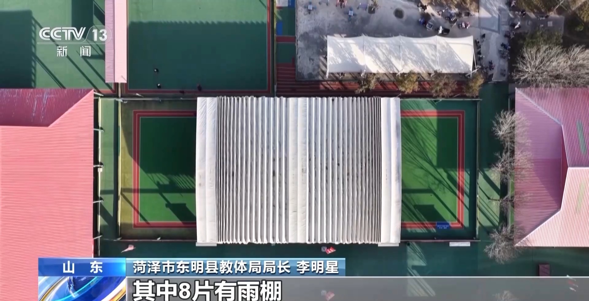 菏泽市东明县教体局局长 李明星:17片连在一起的标准化门球场,其中8片有雨棚,下雨天、刮风天,老百姓都能够进行体育锻炼。