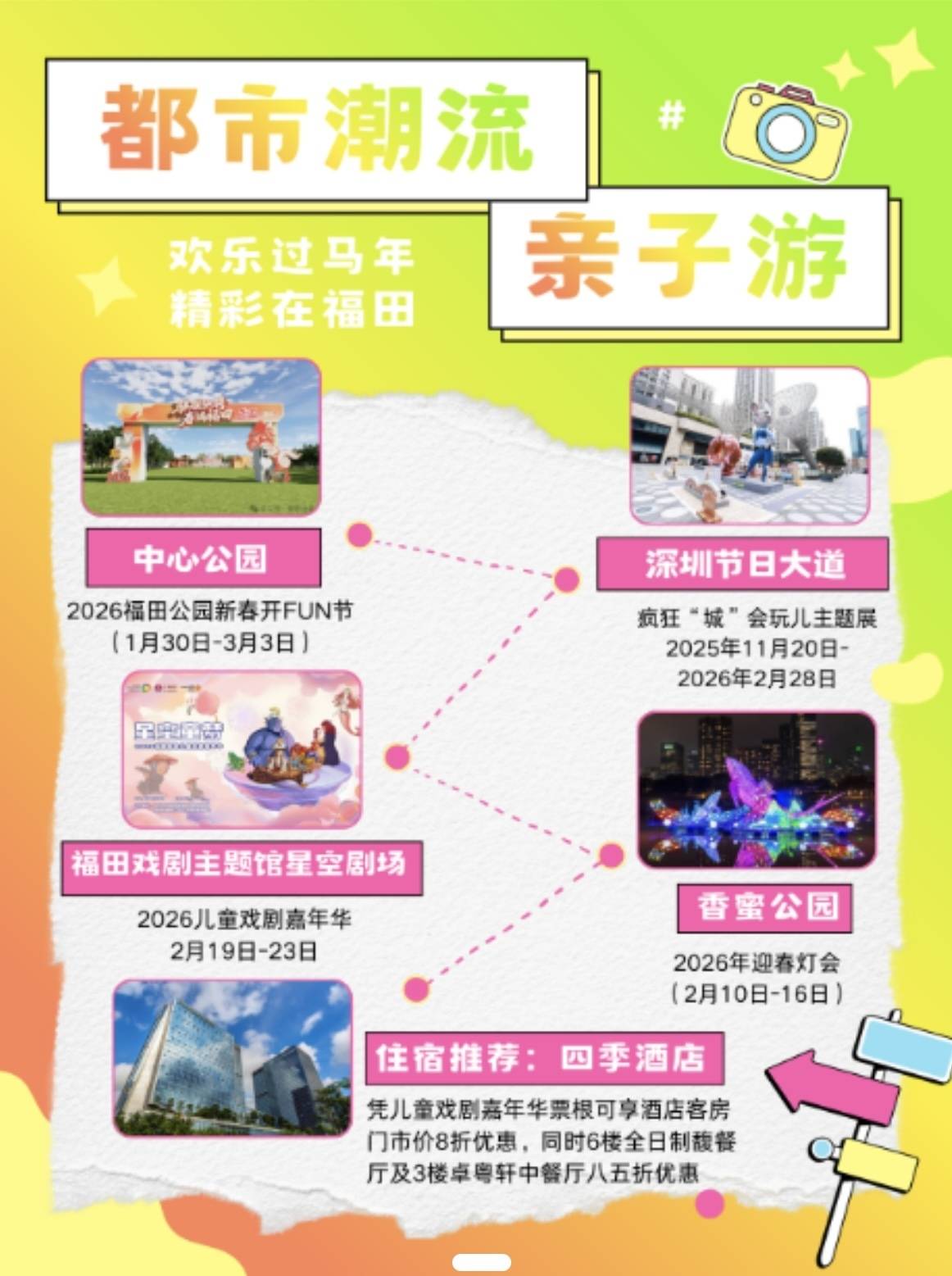 在2026儿童乐园开启「童趣天地 童趣悦福」的欢乐时光,到深圳节日大道打卡「疯狂‘城’会玩儿主题展」;走进福田戏剧主题馆星空剧场,邂逅「2026儿童戏剧嘉年华」,再到香蜜公园邂逅「2026年迎春灯会」的璀璨光影,最后入住四季酒店,解锁新春遛娃新玩法。