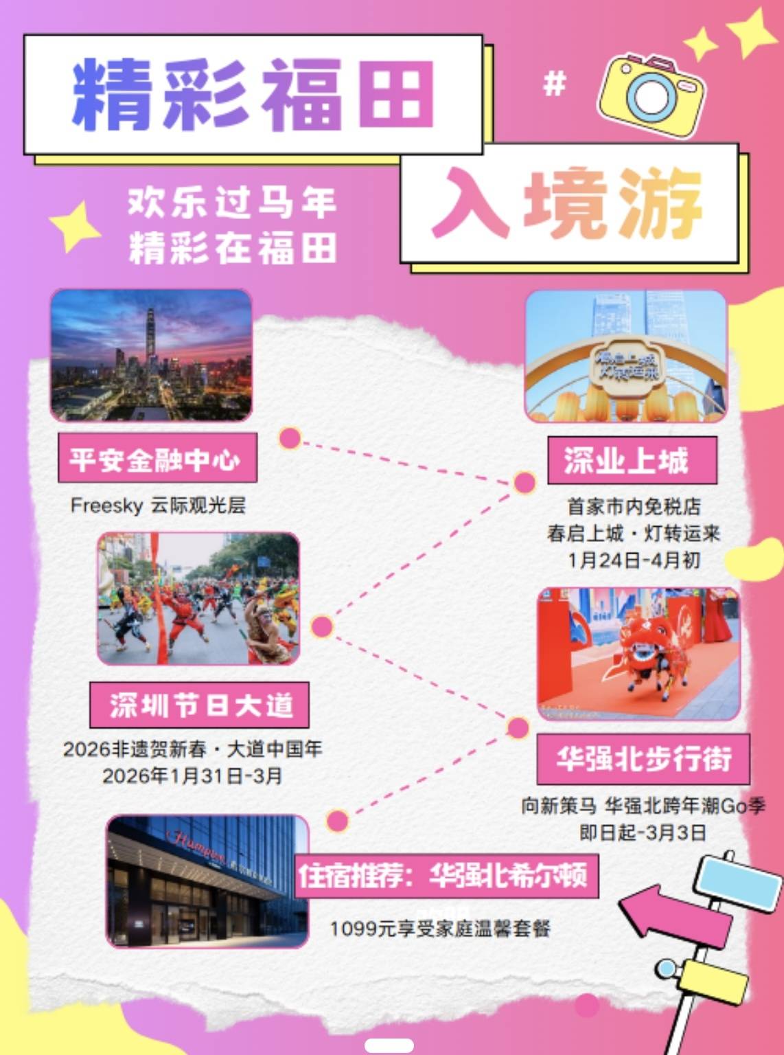 从平安金融中心Freesky云际观光层俯瞰城市天际线,到深业上城打卡首家市内免税店,参与「春启上城・灯转运来」主题活动;再到深圳节日大道沉浸式体验「2026非遗贺新春・大道中国年」,走进华强北步行街感受「向新策马 华强北跨年潮Go季」的活力,最后入住华强北希尔顿,邂逅福田入境游的多元魅力。