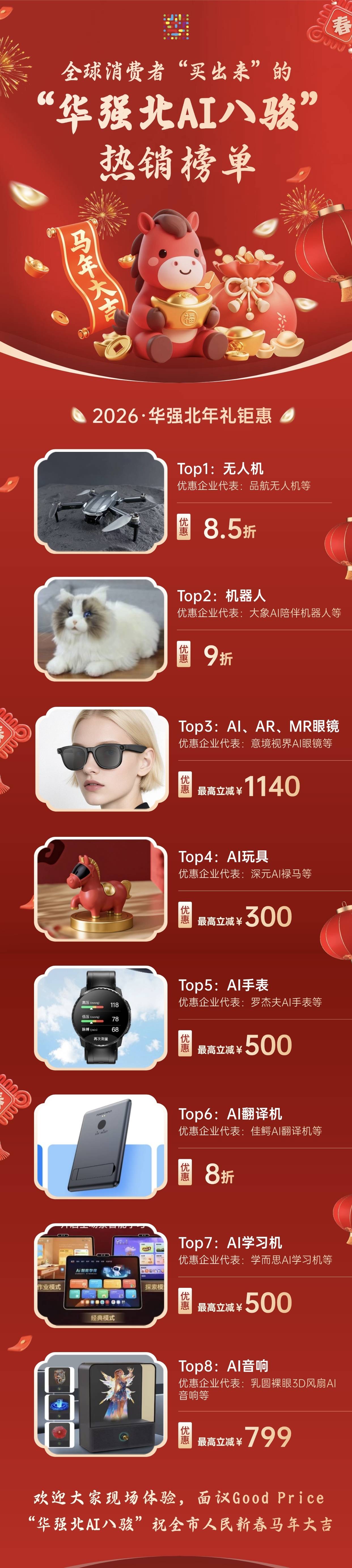 乘着新春消费与AI科技热潮,华强北以销售数据、科技领先度、价格优惠、消费者青睐度四大维度,评选出「华强北AI八骏」消费榜单,用市场口碑甄选高性价比AI潮品,承包你的新春送礼清单!八大硬核品类