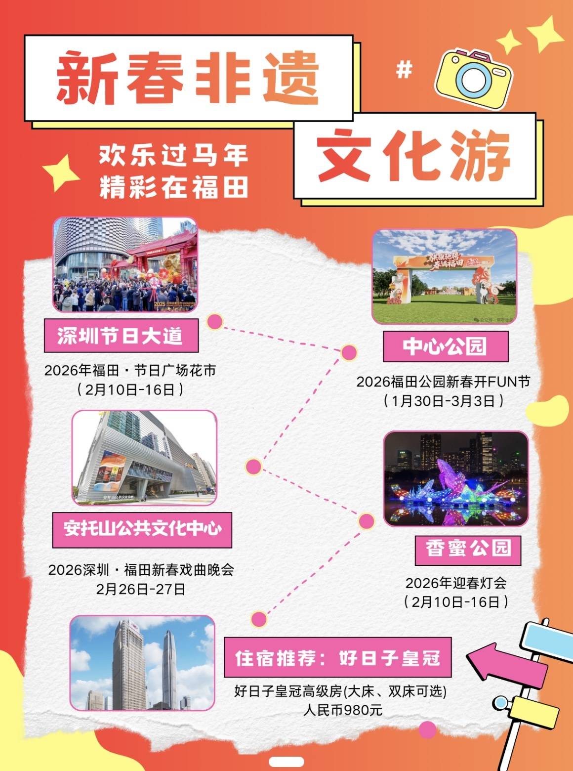 在深圳节日大道逛「2026年福田・节日广场花市」,到中心公园参与「2026福田公园新春开FUN节」;走进安托山公共文化中心,欣赏「2026深圳・福田新春戏曲晚会」的精彩演绎,再到香蜜公园邂逅「2026年迎春灯会」的璀璨光影,最后入住好日子皇冠假日酒店,沉浸式感受传统年味。