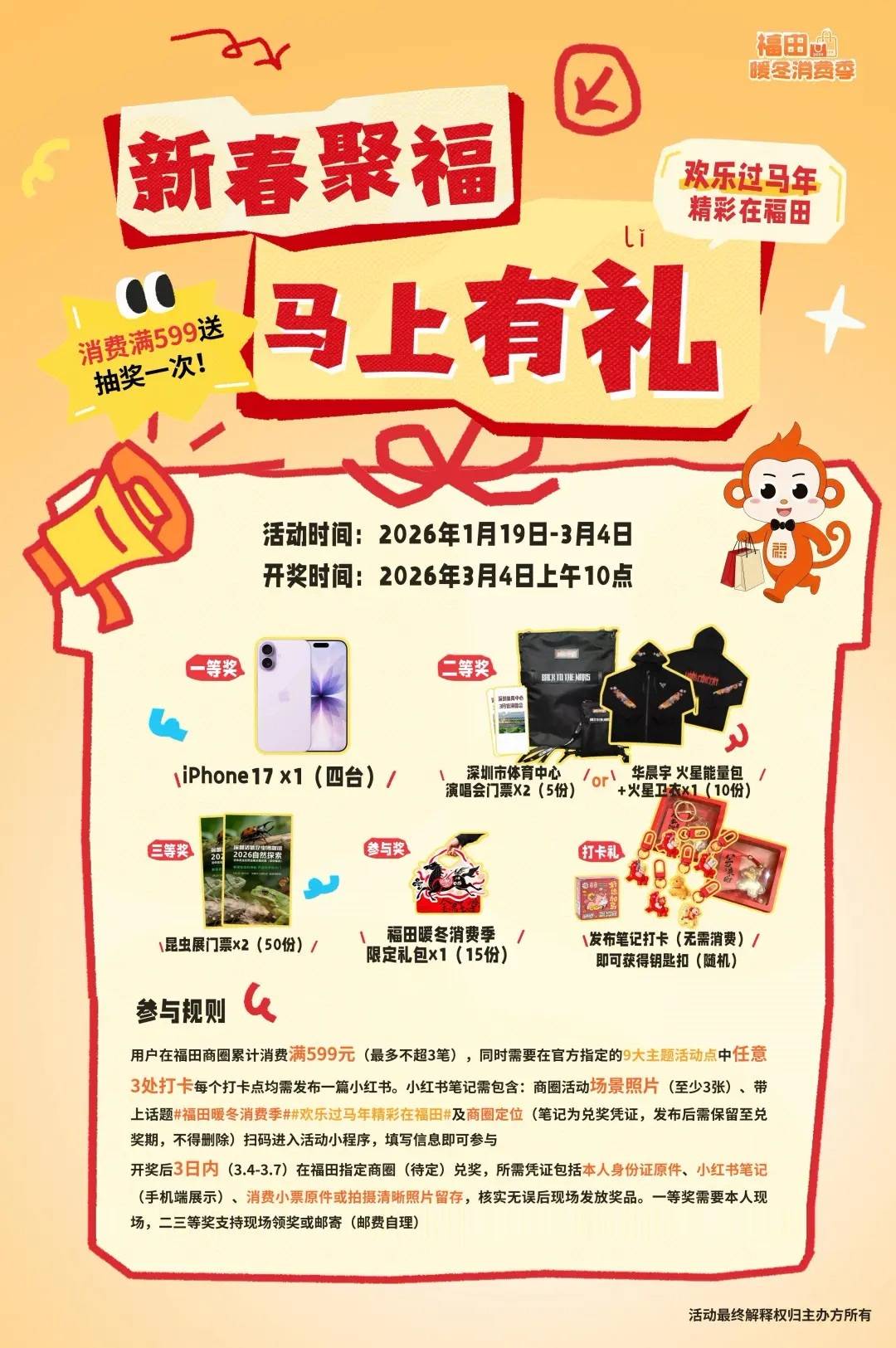 3. 小红书笔记含≥3张商圈活动照+商圈定位,带话题#福田暖冬消费季##欢乐过马年精彩在福田#(笔记需保留至兑奖期)