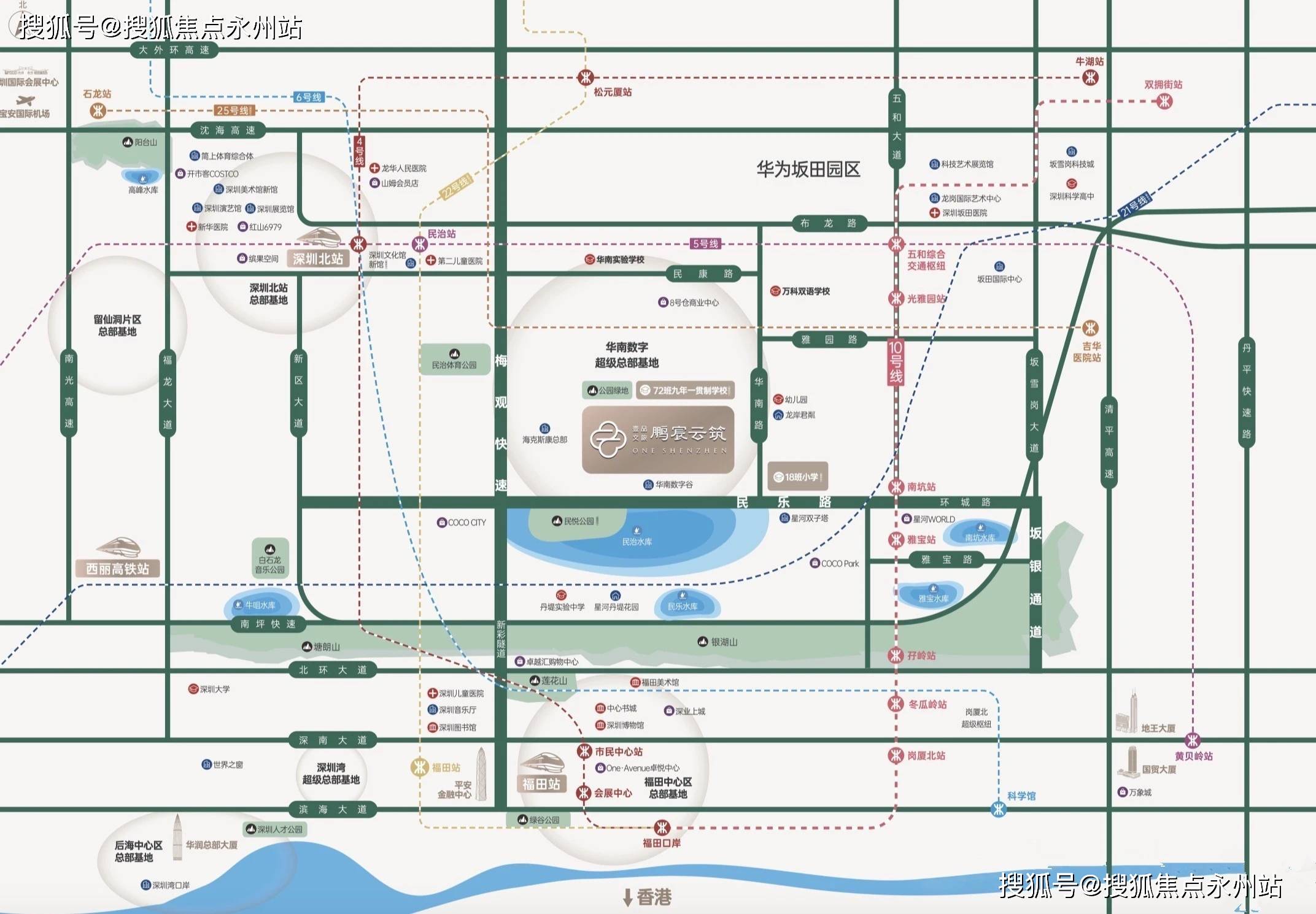 地铁:距离10号线站到岗厦北,规划中的 22 号线年通车后可实现福田⇌观澜45分钟直达深圳市龙华区政府。