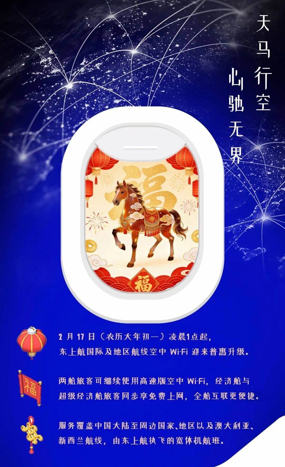 中国东方航空公司介绍,将于除夕(2月16日)12:00起全面升级空中Wi-Fi服务,覆盖东上航所有由宽体机执飞的国内、国际及地区进出港航班,让万米高空的旅程告别“断网”,实时分享新春年味、同步收看春晚直播。