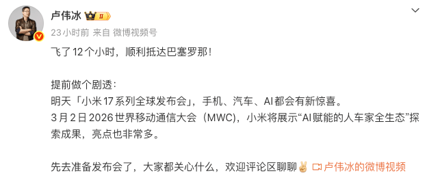 小米集团总裁卢伟冰已抵达巴塞罗那,并剧透发布会上「手机、汽车、AI 都会有新惊喜」。