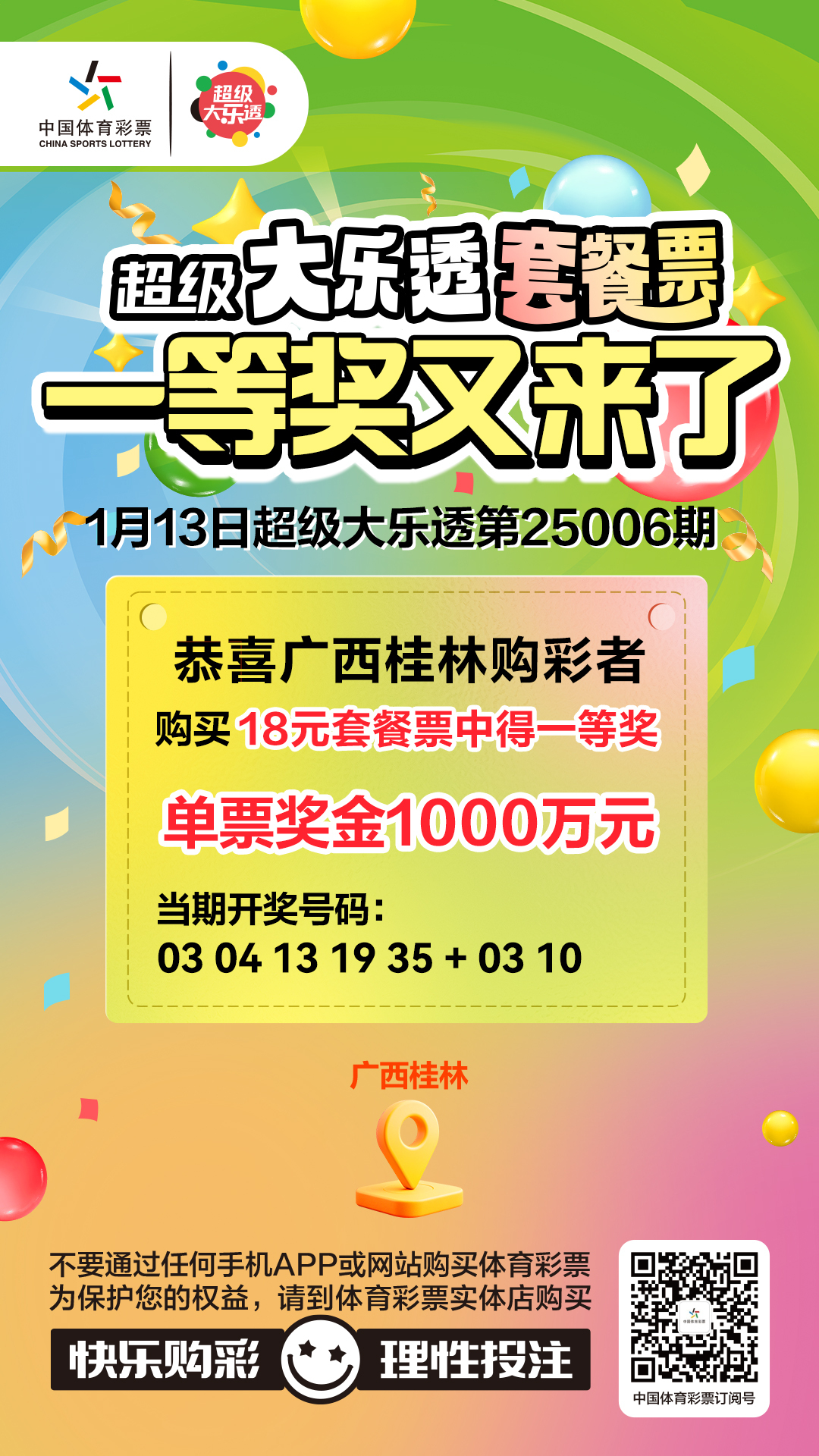 1月13日晚,体彩超级大乐透第25006期开奖,广西桂林一购彩者凭借18元的大乐透套餐票,中得当期1注一等奖,奖金高达1000万元!这是2025年广西体彩中出的首注千万大奖。