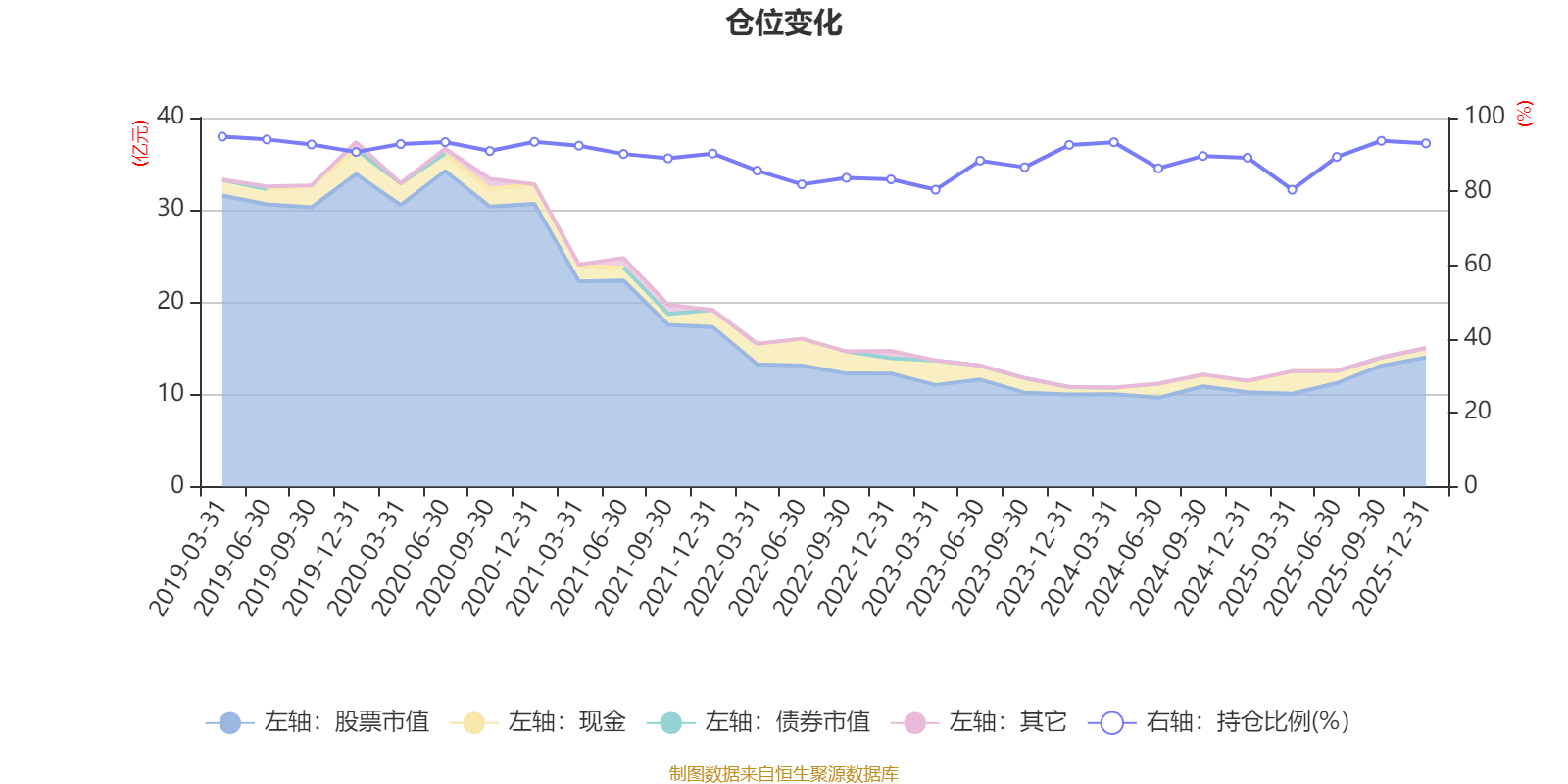 据定期报告数据统计,近三年平均股票仓位为88.56%,同类平均为87.63%。2019年一季度末基金达到94.83%的最高仓位,2025年一季度末最低,为80.45%。